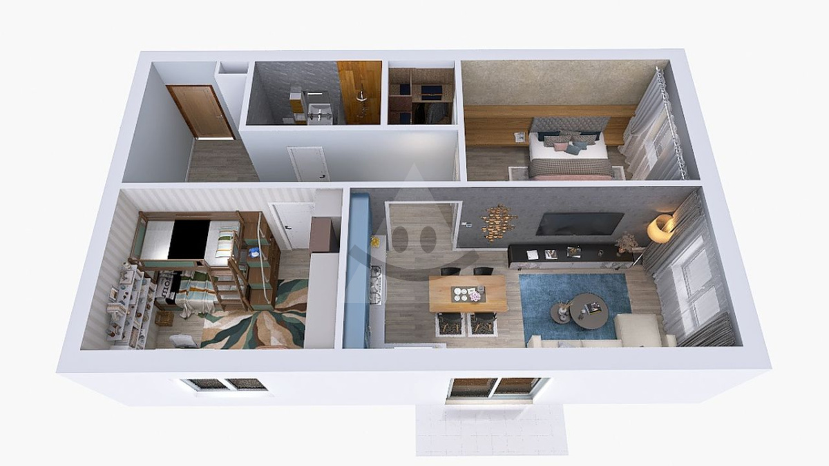 2. typ sa skladá z menšej vstupnej chodby, centrálnej obývacej izby s balkónom prepojenej s kuchyňou, 2 izieb a kúpeľne s WC, k bytu tak isto prislúcha úložný priestor na chodbe